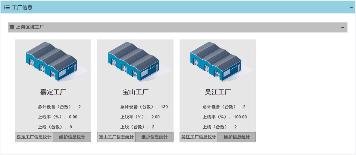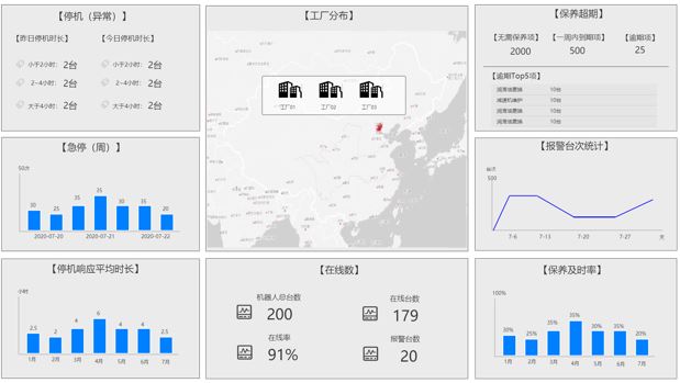 可分開顯示同一區域內多個工廠的數據; 包含機器人數量和上線率。