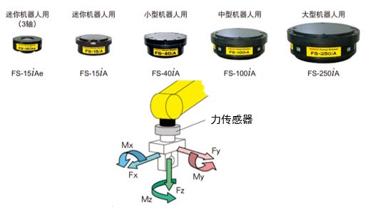 FANUC力傳感器是專門針對FANUC機器人研制出的力覺檢測設備,可同時檢出施加在機器人工具前端任意方向的外力的6個分量的力和力矩。檢測范圍最大可達2500N,分為3軸力傳感器與6軸傳感器兩類五個型號。